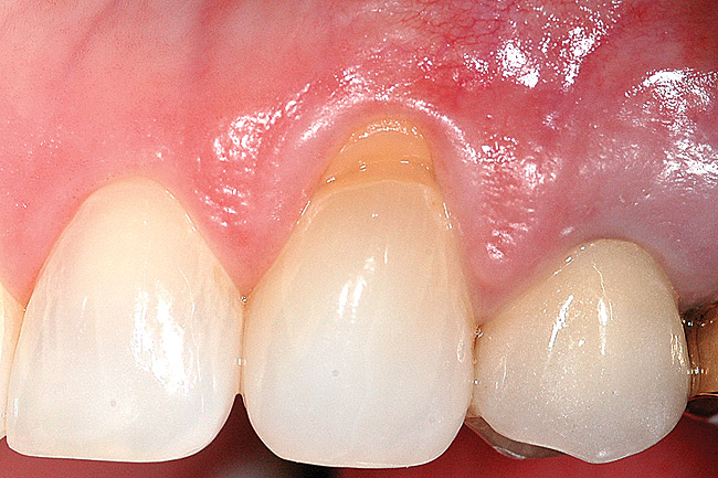If it is necessary to graft and restore, it is preferable to graft first because the outcome can be more precise when the restoration is placed after the root-coverage surgery. In a non-esthetic area, the restoration may be placed first while leaving the root exposed for coverage with the grafting procedure. A graft can predictably cover a root to within 3 mm of the adjacent papillae tips. If there is a difference between the mesial and distal papilla heights, the shorter of the two papillae will determine the level of root coverage. Thus, ideally, a restoration should not extend more than 3 mm apically from the papilla tip, leaving the rest of the root exposed for root-coverage grafting.5