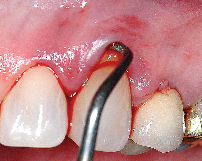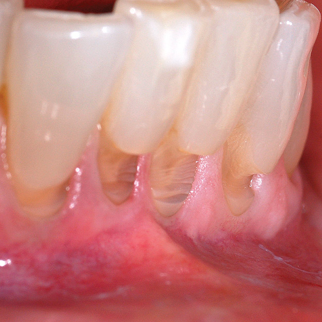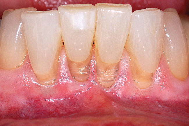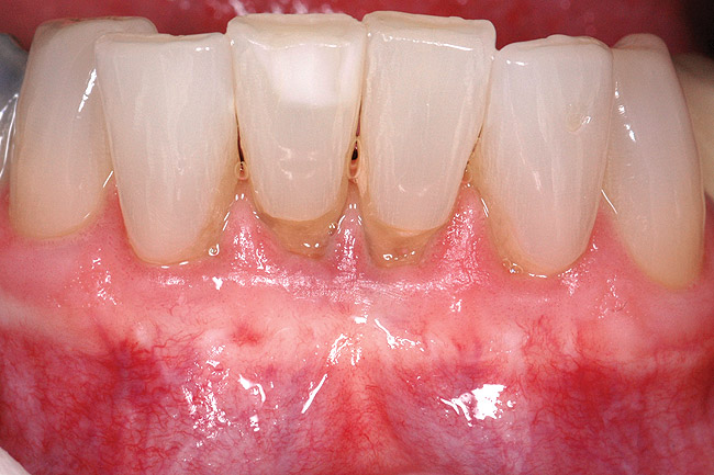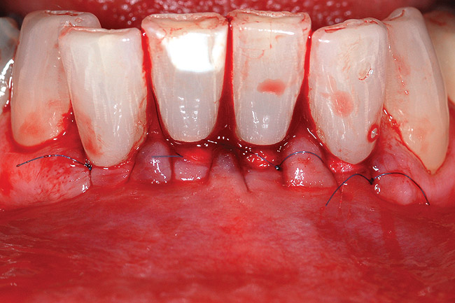 Typically, any gain of keratinized tissue is minimal with a submerged grafting technique as described above. Realistically, a gain of keratinized tissue is not considered to be a significant parameter for submerged grafts. While a gain of keratinized tissue is useful for assessing graft success for surface grafts such as a free gingival graft, the amount of keratinized tissue on the surface is not reflective of the gain of functional, dense collagenous connective tissue with submerged grafts. The small gain of keratinized tissue following a submerged grafting technique is not an indicator of graft success; it is related to initial graft exposure and secondary retraction of the flap’s exposure of a small portion of the graft. The advantages of this minimally invasive grafting technique include: 1) no surface incisions, thus no scarring; 2) use of an allograft eliminates need for a palatal donor site; 3) reduced patient discomfort; 4) greater acceptance of treatment; and 5) ideal esthetics. Palatal grafts are also very effective for achieving predictable root coverage, but they are subject to enlarging, thereby negatively impacting the esthetic outcome. Graft enlargement may be desirable in ridge or papilla augmentation procedures, thus palatal connective tissue may be a better choice for these applications. In sites where the graft cannot be completely covered, palatal tissue will perform better than an allograft. Otherwise, an allograft is the better choice.