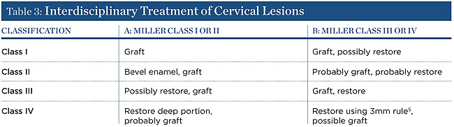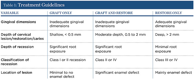Treatment planning for cervical lesions is simplified by the assessment of five variables: 1) gingival dimensions; 2) depth of cervical lesion/restoration/caries; 3) depth of recession; 4) classification of recession; and 5) location of the lesion. The guidelines for treating cervical lesions based on these five variables are shown in Table 1.