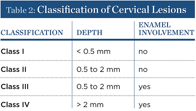 The authors have devised and published a classification of cervical lesions based on the depth of the cervical lesion and whether or not there is enamel involvement: