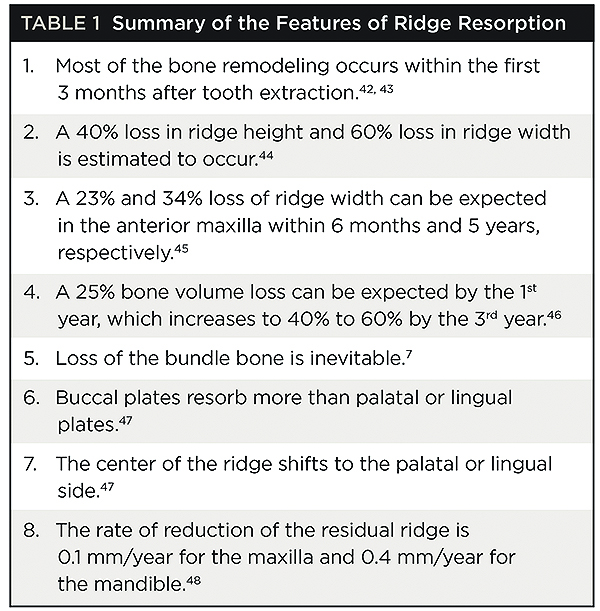Model analysis found that the buccal bone resorbed to a greater extent, thus pushing the center of the ridge palatally or lingually.4 Histological evidence from a canine model showed that after tooth extraction, the bundle bone was resorbed, resulting in greater buccal bone height and width reduction compared to the other surfaces. It was found that at sites with facial bone thickness of ≤1 mm, significant vertical bone resorption of 7.5 mm was measured, as compared to sites with thick facial bone, which had only a 1.1-mm reduction in bone height.5 This phenomenon occurs because the mid-facial buccal bone is generally thinner than the palatal bone,6 has less blood supply, and is thus more prone to resorption.7 A recent systematic review of 20 human clinical trials reported that ridge resorption after tooth extraction occurred mainly in the first 3 months, with horizontal ridge resorption ranging from 29% to 63% (2.46 mm to 4.56 mm) and vertical ridge resorption from 11% to 22% (0.8 mm to 1.5 mm).8 A mid-buccal bone height reduction of 1.67 mm, which could significantly affect the fabrication of an esthetic restoration, was also reported.9 A summary of the features of ridge resorption is provided in Table 1. With this significant amount of bone loss after tooth extraction, the volume of bone available to encase a dental implant in the ideal 3-dimensional (3D), prosthetically driven position is inadequate. Therefore, methods to preserve the ridge dimensions have been proposed.