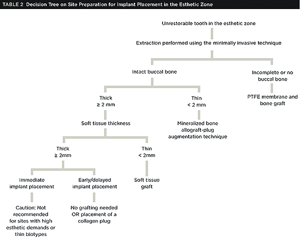 Table 2 shows a decision tree on site preparation for implant replacement in the esthetic zone. An unrestorable tooth in the esthetic zone that will be replaced by an implant-supported restoration should be removed with a minimally invasive technique to preserve the bony contours. After the tooth is removed, a decision to proceed with immediate implant placement or site preservation and early or delayed implant placement must be made. If the socket defect is well contained, with a thick buccal plate (≥2 mm), thick soft tissue (≥2 mm), and primary implant stability can be achieved, immediate implant placement may be attempted. It is important to bear in mind that the implant must be placed in a prosthetically sound 3D position, and it is technically more difficult to do so at an extraction site where the tooth was just removed. This is because implant osteotomy drills tend to shift to the side of least resistance, which in this case, is towards the buccal surface. If the implant is placed buccally, there is an increased risk of mid-facial mucosal recession over time.41 Therefore, due to the technical difficulty in immediate implant placement, it is recommended that the procedure be performed in sites with minimal esthetic concerns.