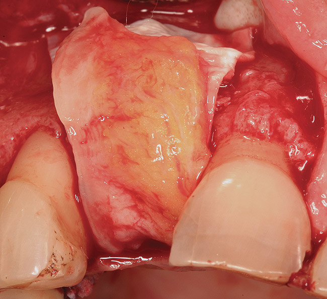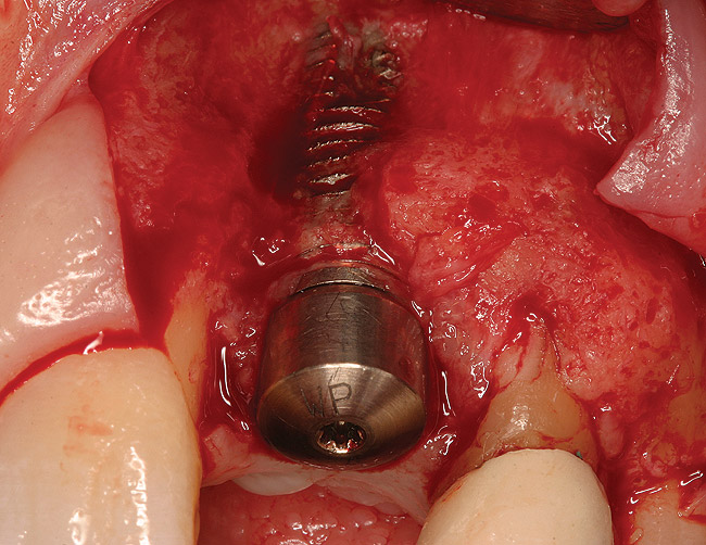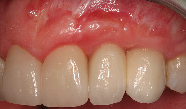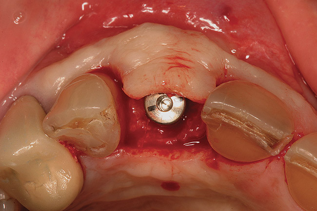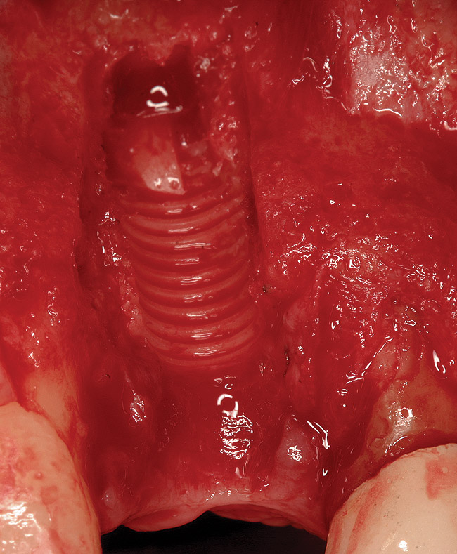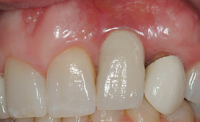 The chief complaint of a 48-year-old woman who presented to her restorative dentist was, “I don’t like the way my implant looks” (Figure 1). This implant had been placed by a previous periodontist and restorative dentist. The patient is now seeking a second opinion. In evaluating this case upon referral to the periodontist, a reddened appearance of the gingival and mucosal tissue encompassing almost the entire facial aspect could be observed. In addition, the radiographs demonstrated a 5-mm diameter implant in place with a deciduous cuspid in the place of No. 11. Deep probing depths were noted around the facial aspect of the implant, and threads could be detected under the tissue.