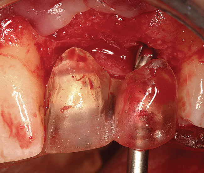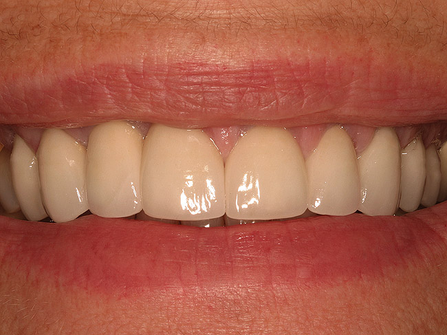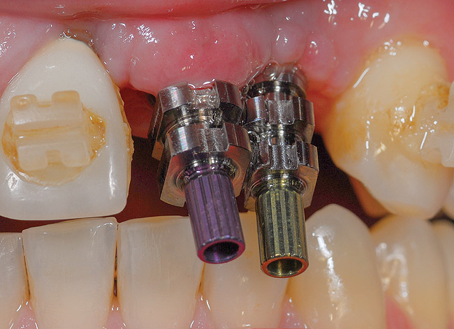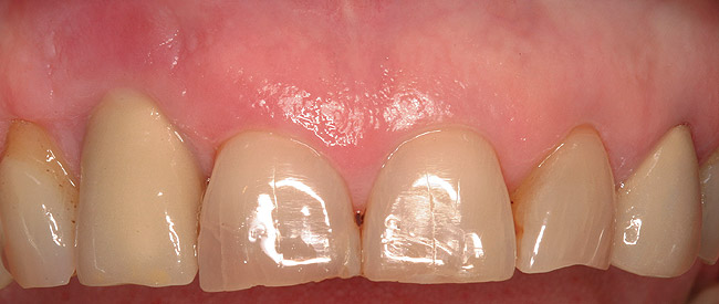 Ideal esthetic treatment planning and discussion with patients needs to include a thorough evaluation of the entire anterior quadrant. The potential to do contralateral crown lengthening to help match the expected soft-tissue deficiencies of implant restorations may be an important discussion. Another important consideration is the number of implants needed to replace missing teeth. Almost invariably, patients initially expect individual “teeth” to replace the lost or failing ones. A careful evaluation of the edentulous space should be done with a realization of the difficulty in papilla creation between two implants and especially when they are within 4 mm of each other. Of course, it is well understood that when available space “forces” an implant placement too close to an adjacent natural tooth (< 1.5 mm), the expectation of papilla loss is very high.15,16 It may also be helpful to explain that an ovate pontic supported by a single or multiple implants sometimes has a much higher esthetic potential. From a restorative perspective, it is sometimes more esthetic to splint together multiple crowns, even when they could be separate, to allow the ceramist the greatest opportunity to hide the gingival deficiency. One of the most difficult decisions is the removal of teeth that could be saved to give greater predictability to the functional or esthetic outcome.