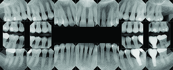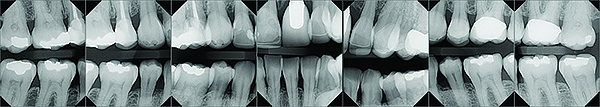 A series of full-mouth diagnostic radiographs that visualize each tooth or implant are critical as a baseline (Figure 11). The frequency and type of radiographs needed at maintenance depends on the severity of periodontal disease, as well as the extent of restorative treatment and caries susceptibility. With more advanced periodontal disease and restorative concerns, more frequent radiographs may be indicated. Vertical bitewing radiographs provide a better view of osseous crest levels and should be considered over horizontal bitewing radiographs for periodontal cases (Figure 12).