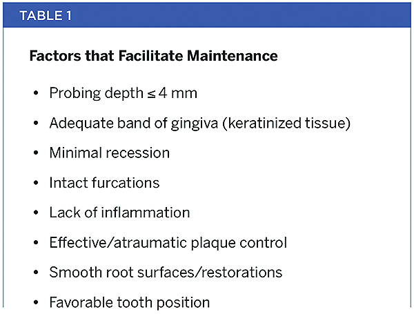 Since periodontal maintenance follows active therapy, the goal of that treatment should be aimed at helping the patient and therapist long-term. There are a number of factors that may contribute to facilitating periodontal maintenance for the patient and dental team (Table 1). Minimal probing depths, adequate bands of keratinized tissue, minimal recession, absence of furcation defects, lack of inflammation, effective plaque control, and favorable tooth position influence periodontal health and are goals of active therapy. These components are all part of a comprehensive periodontal evaluation (CPE)13 and provide the baseline data to monitor maintenance success and offer insight into whether additional treatment is necessary.
